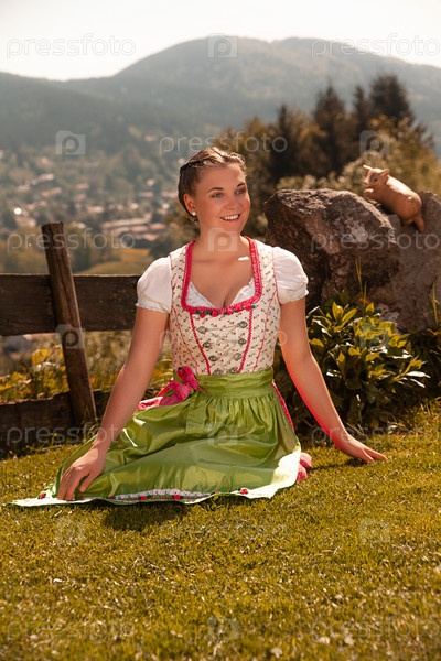 Баварская молодая женщина в дирндле, сидящая на траве под солнцем