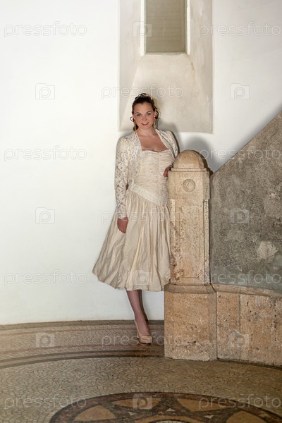 Удивительная молодая женщина в декоративном белом платье и белых розах в волосах позирует в старой башне