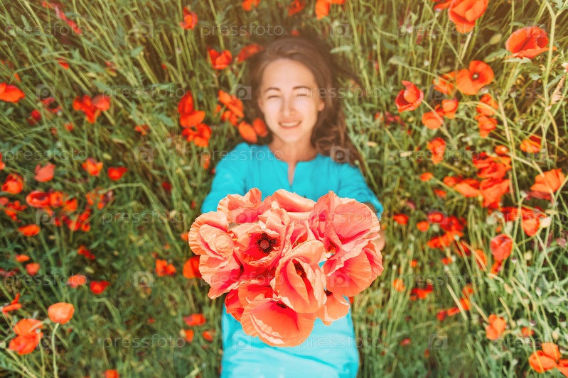 Счастливая молодая женщина, лежащая на цветочном лугу