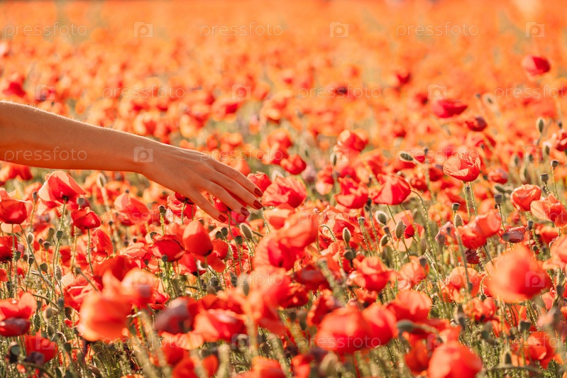 Женская рука касается красных маков на поле