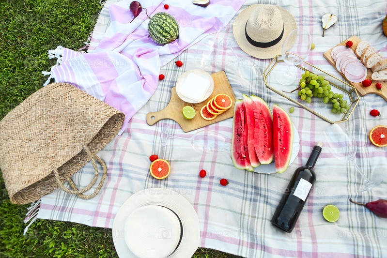 Пикник с белым вином на зеленой траве