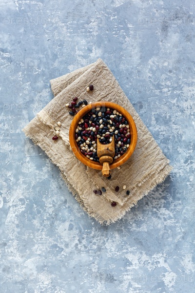 Красочные бобы и ложка в деревянной таре