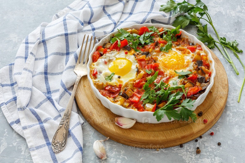 Пикантная шакшука с яйцами, баклажанами и помидорами
