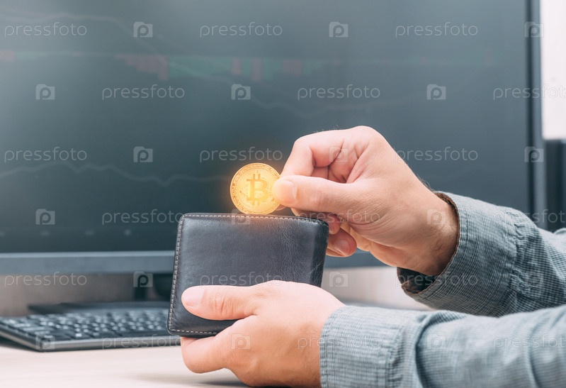 Человек держит золотые биткойны и кладет их в кошелек