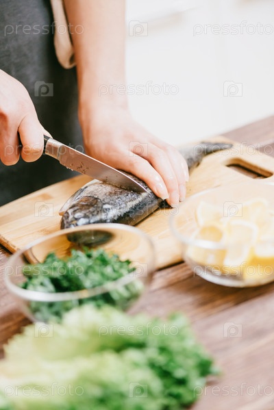 Женщина режет сырую рыбу на кухне