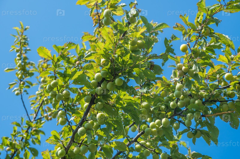 Молодой зеленый плод сливы на дереве, фрукты