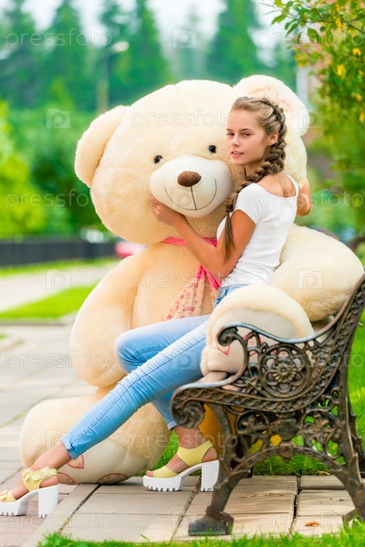Молодая девушка на скамейке с любимым плюшевым медведем в парке