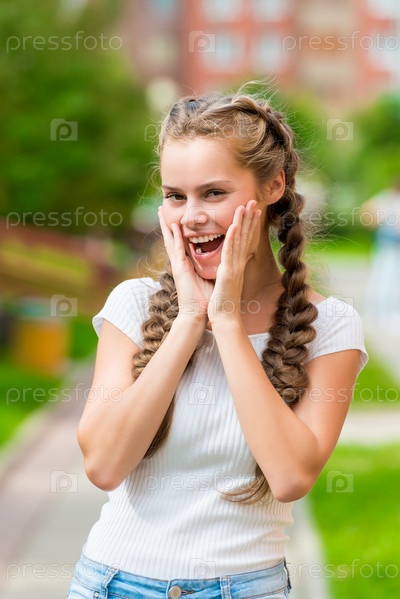 Эмоционально радостная девушка с двумя косичками, позирующая в летнем парке
