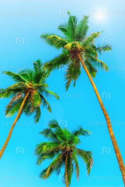 Три зеленых кокосовых пальмы с орехами на фоне неба