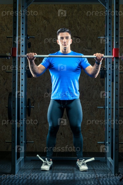 Портрет спортсмена в синей футболке на тренажерном зале с баром, готовым к тренировкам