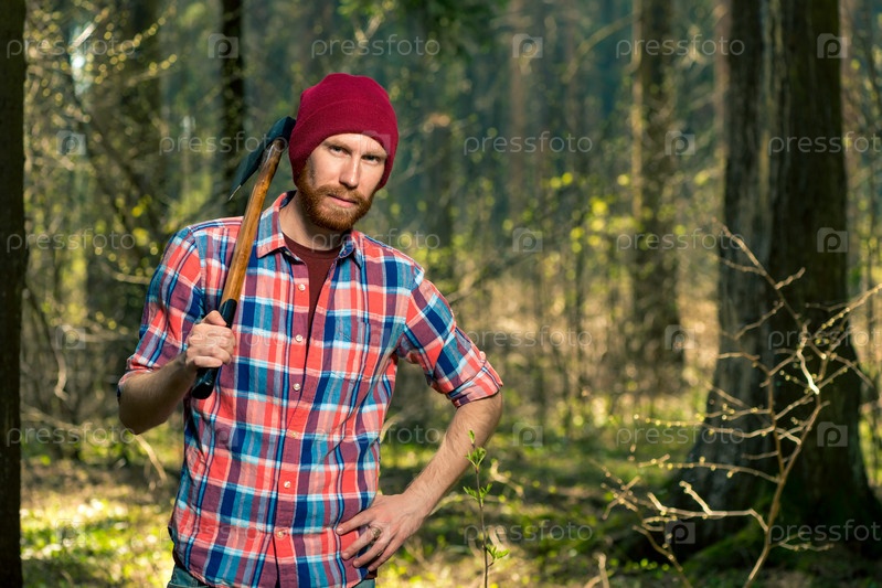 Портрет леснича с бородой и топором в рубашке в лесу