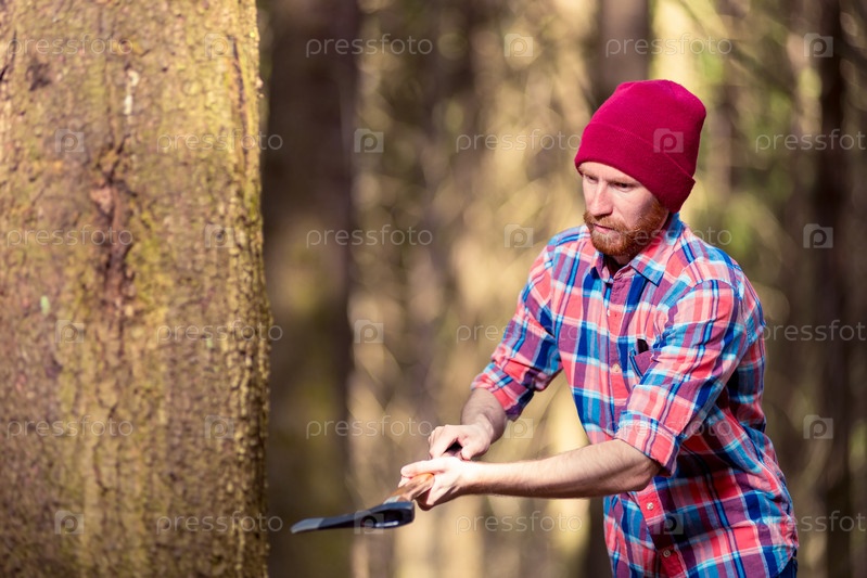 Лесоруб, работающий с топором; лесничий - хипстер, рубящий дерево