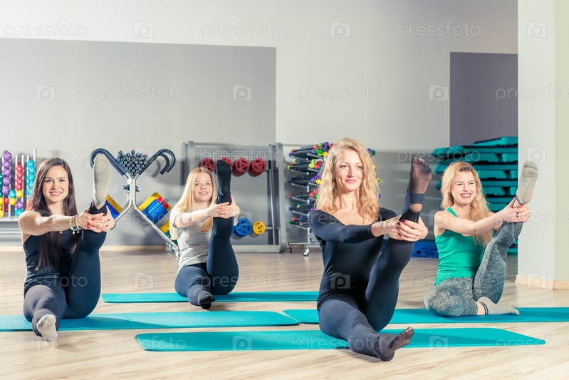 Счастливые молодые женщины на тренировке в спортзале, групповых упражнениях йоги