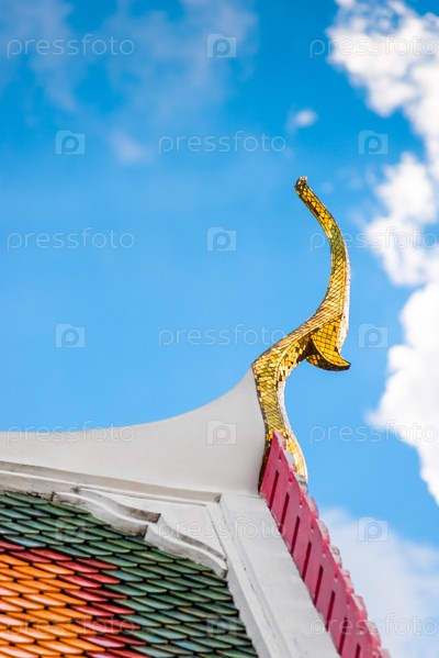 Красивое украшение здания на фоне неба, детали крыши в ближайшем плане