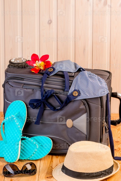 Большой серый чемодан, набитый вещами. вокруг чемодана одежда и обувь для пляжного отдыха