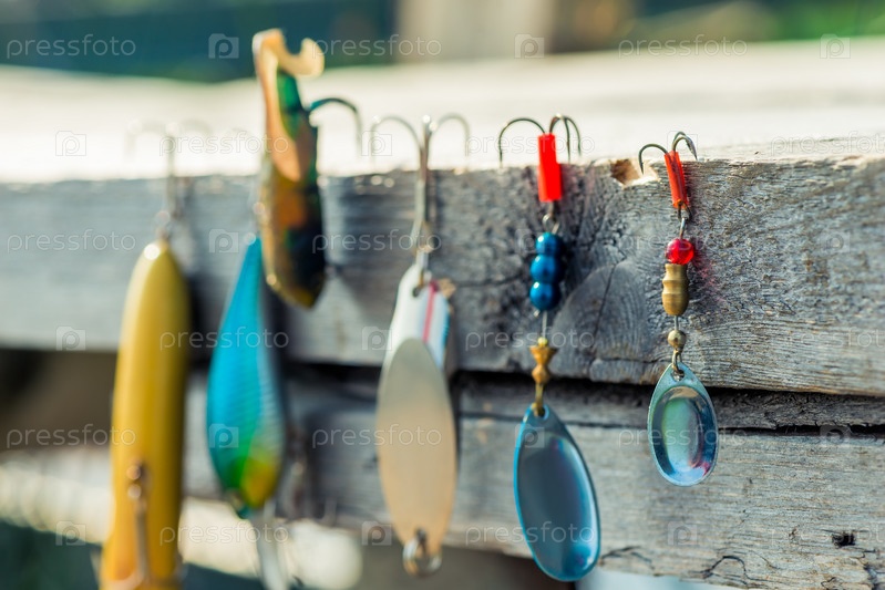 Близкий план пузырей и крюков для рыбалки близок на деревянном пирсе