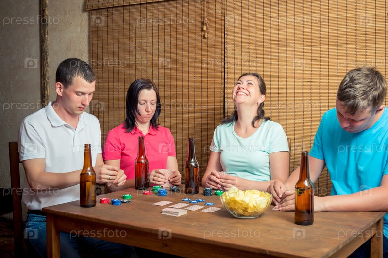 Молодые друзья играют в карты, сидят за столом внутри и пьют пиво
