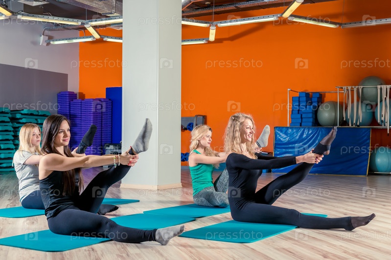 Молодые женщины тренируются в спортзале, групповые занятия йогой