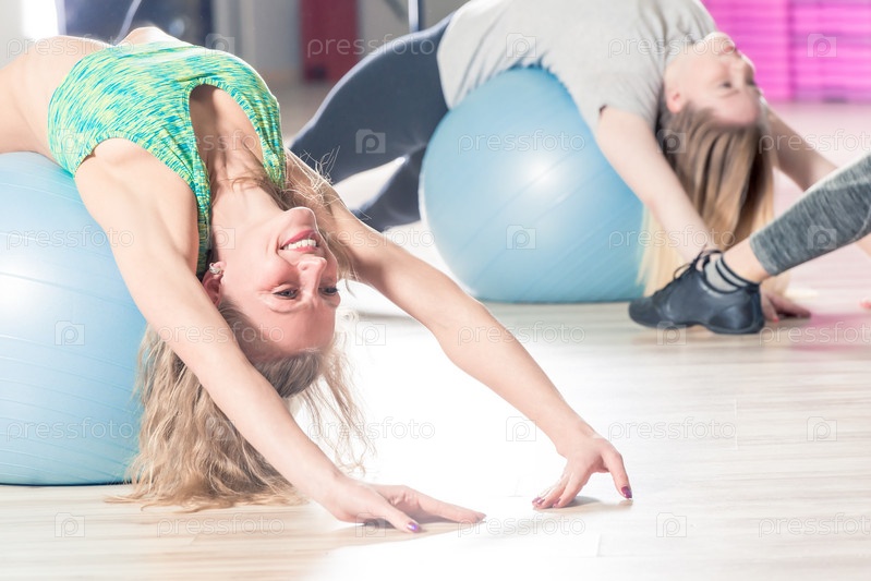 Женщина в группе занимается пилатесом на гимнастических мячах