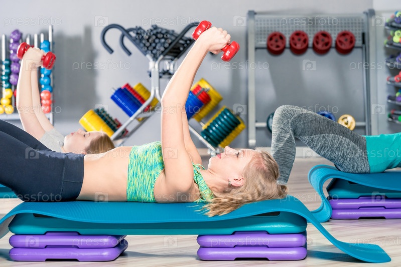 Женщина поднимает гантели лежа, занятия в тренажерном зале в группе