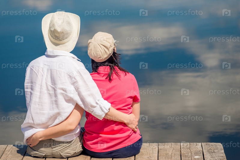 Счастливая пара обнимается и наслаждается отдыхом возле красивого озера, вид сзади