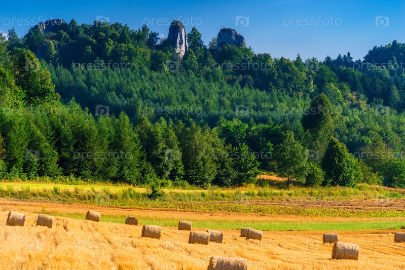 Ландшафт - поле после сбора урожая, на поле стола сена