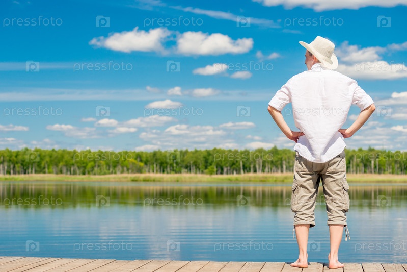 Человек в полную длину с голыми ногами на деревянном пирсе на фоне красивого озера