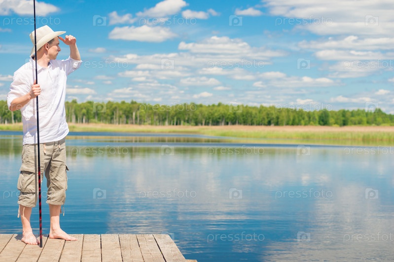 Портрет рыбака на пирсе, смотрящего в сторону озера