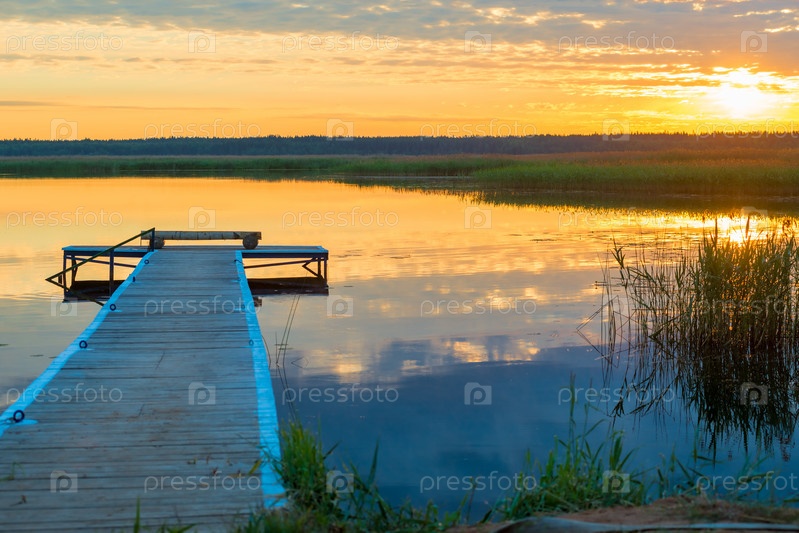 Оранжевое солнце на закате над живописным озером с красивым деревянным пиром
