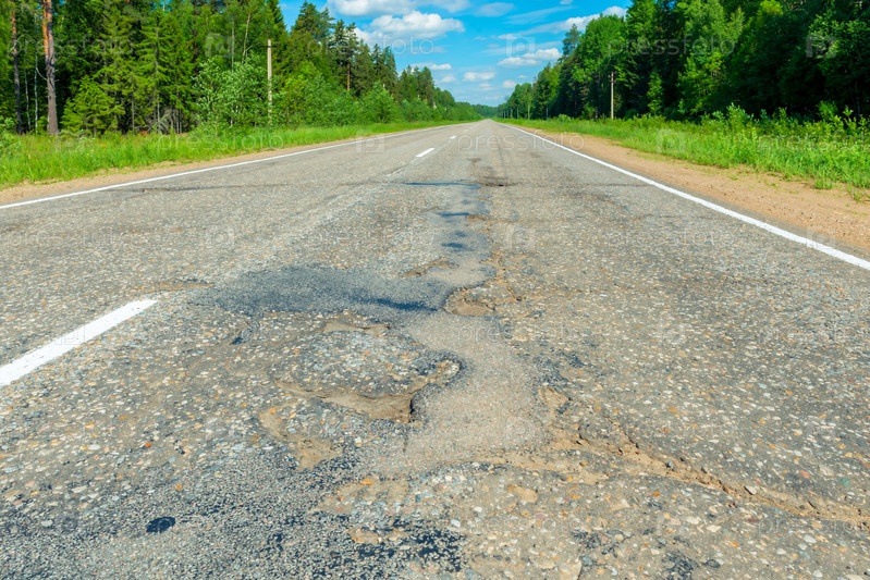 Пустая дорога с дырами и пятнами асфальта