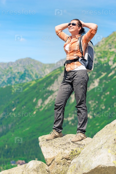 Счастливый турист в солнечный день в горах на походе, наслаждаясь пейзажем