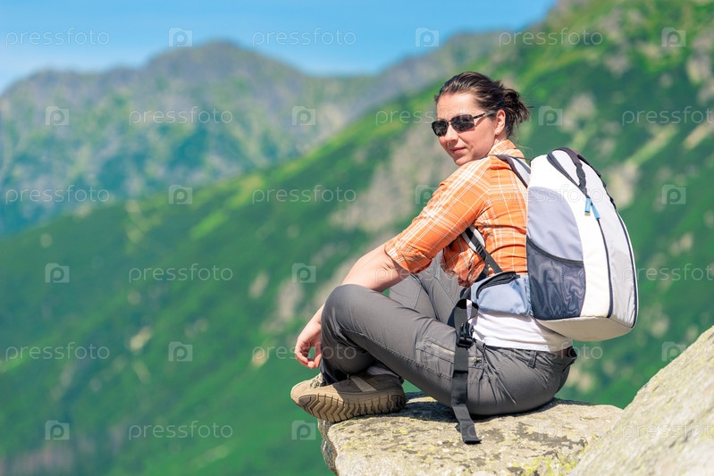 Портрет женщины, сидящей на скале в горах с рюкзаком и отдыхающей под прекрасными пейзажами
