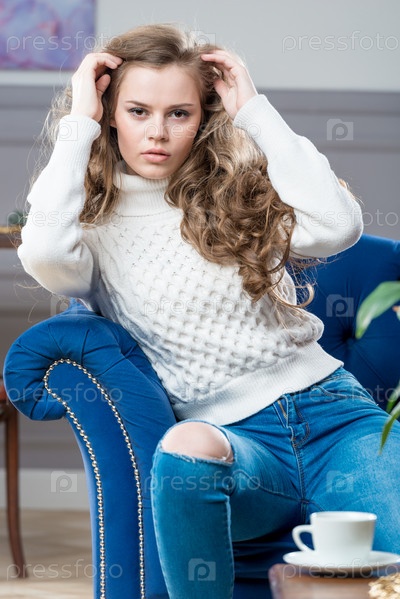 Очаровательная молодая девушка сидит в гостиной на голубом диване и позирует