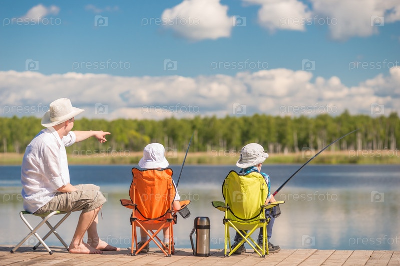 Отец показывает своим детям место кусания рыбы на озере, рыбалка в качестве хобби