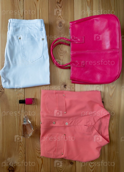 Женская одежда на деревянном полу с аксессуарами