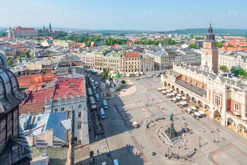 Главный туристический и исторический центр Крака в Польше, на снимке с верхнего вида Торговых рядов, Тауэр-холл