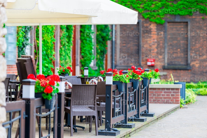 Открытое уличное кафе с цветами в европейском городе