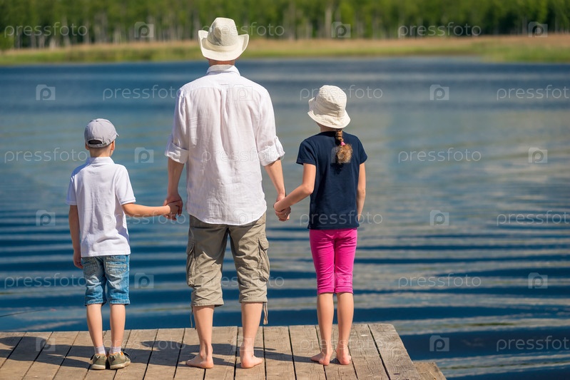 Отец с двумя детьми восхищаются красивым живописным озером, вид со спины