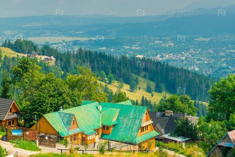 Деревня в долине у подножия горы в Закопане, Польша с высоты
