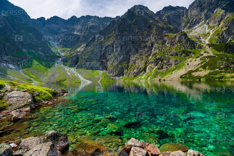 Прозрачная вода чистого горного озера Черный Став в Татрах