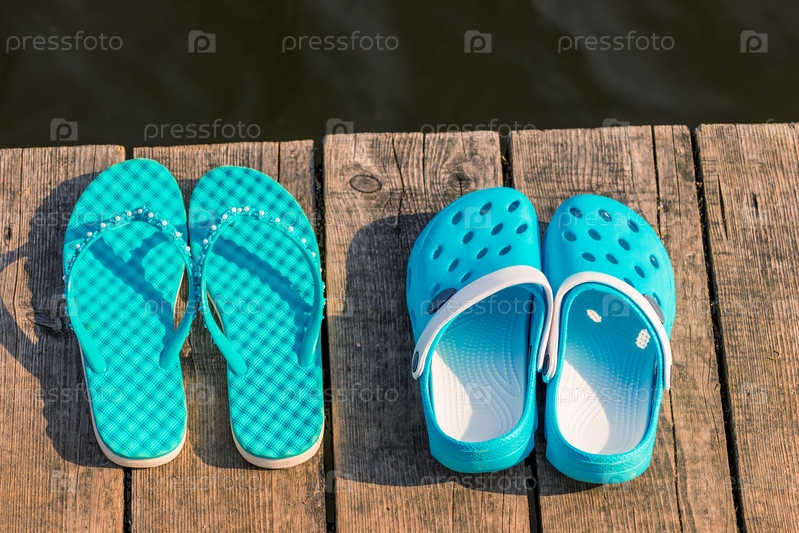 Две пары бирюзовых сланцев на краю деревянного пирса, без людей