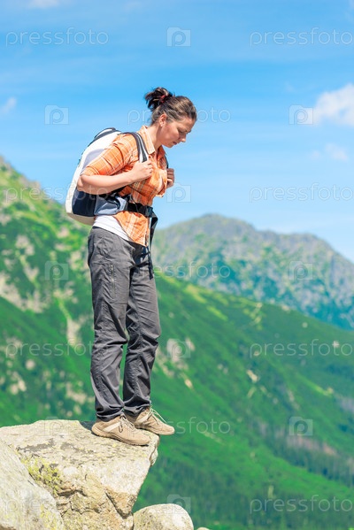Женщина-туристка с рюкзаком стоит на скале и смотрит вниз, опасный маршрут