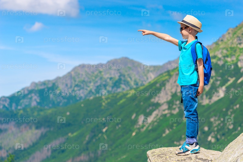 Портрет мальчика-путешественника, стоящего на скале и указывающего на гору