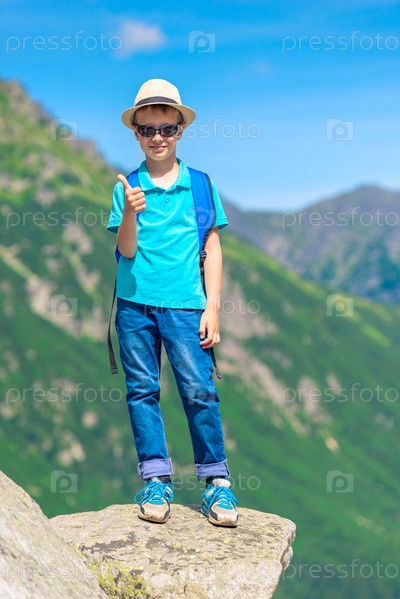 Вертикальный портрет счастливого маленького путешественника с рюкзаком на фоне гор