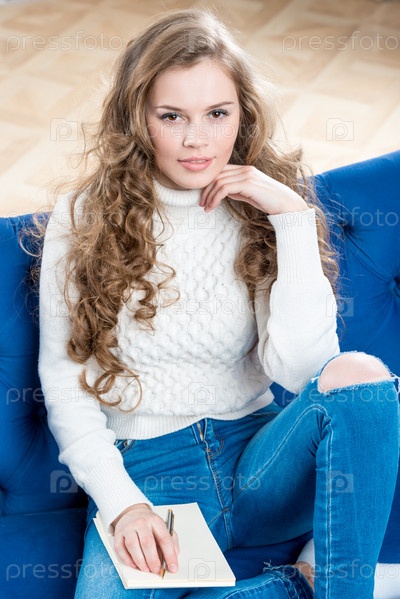 Вертикальный портрет красивой девушки в теплом свитере на диване