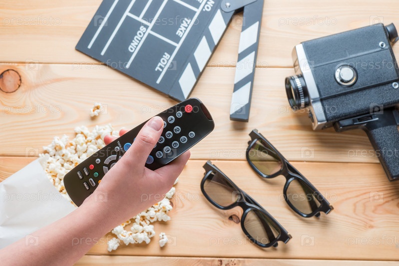 Близкий снимок пульта дистанционного управления телевизором в женской руке на фоне объекта киноиндустрии