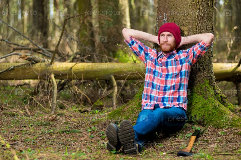 Мечтательный и усталый бородатый лесничий с топором на отдыхе в лесу