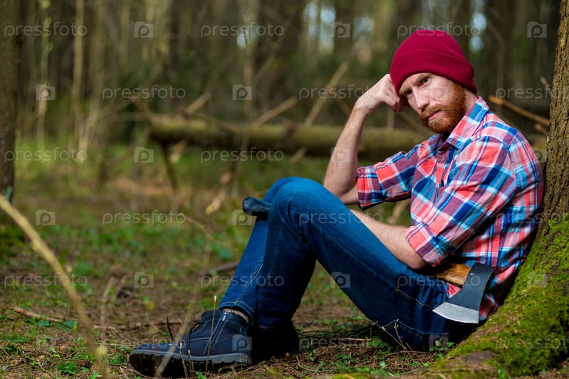 Вдумчивый бородатый лесоруб на отдыхе возле дерева в лесу