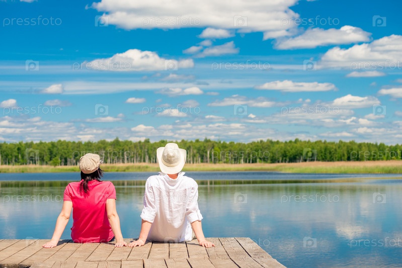 Молодая пара наслаждается красивым озером, сидя на деревянном пирсе