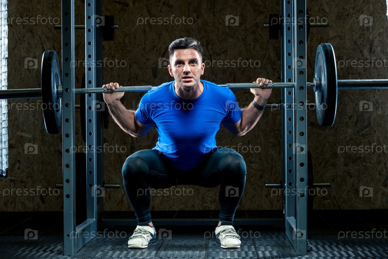 Горизонтальный портрет спортсмена с штангой делает усилия в тренажерном зале, бодибилдера на тренировке